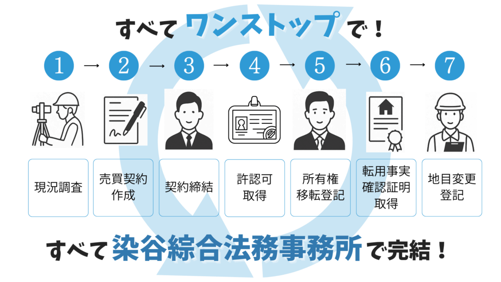 農地転用許可、開発許可、測量、建築設計、工事施工、不動産売買、各種契約など