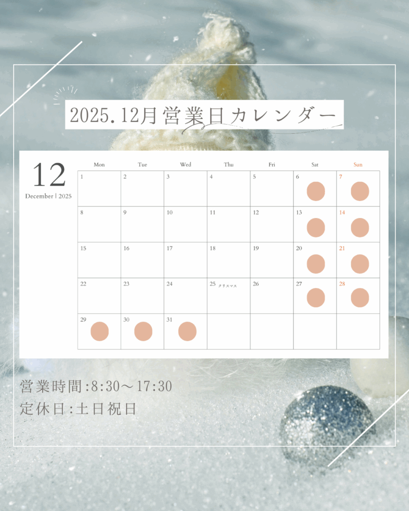 また、年末年始は12月27日(土)から1月4日(日)までお休みをいただく予定でございます。