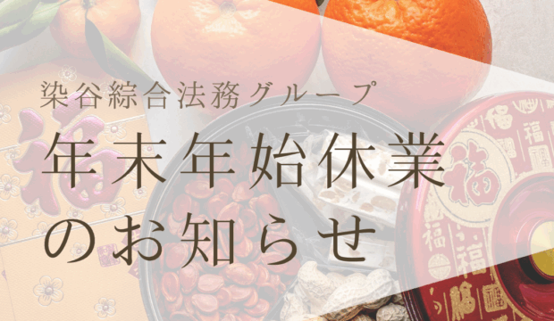 同グループの行政書士染谷綜合法務事務所の年末年始のお休みは、令和5年12月29日(金)から令和5年1月3日(水)までとなります。初日業務は令和6年(2024年)1月4日(木)から開始します。